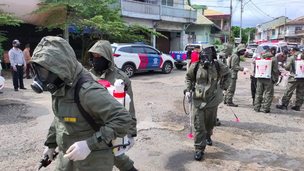 SINGKAWANG, KITA – Sebanyak 2150 personel gabungan yang terdiri dari TNI, Polri, Satpol PP, Manggala Agni, Pemadam Kebakaran, ASN hingga ditingkat kelurahan dan masyarakat bergotong-royong melakukan penyemprotan disinfektan diseluruh Kota Singkawang. 26 Maret 2020.