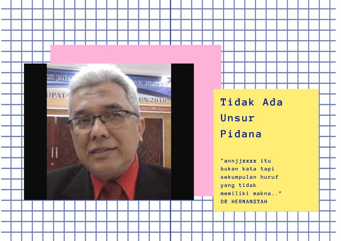Selepas melakukan telaah dengan dua sifat tersebut, Dr.Hermansyah SH. M.Hum menilai kasus ini tidak memiliki unsur pidana karena yang dipermasalahkan adalah bukan kata, namun berupa sekumpulan huruf yang tidak memiliki arti.