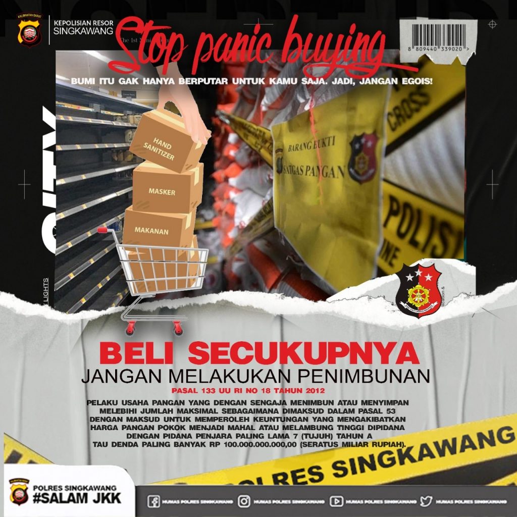“Kami juga menghimbau kepada masyarakat kota singkawang agar tidak melakukan panic buying dan penimbunan barang-barang pokok atau penting, tetap lakukan social distancing, jaga pola hidup bersih dan jaga kesehatan serta tetap berdoa bersama-sama kepada Allah swt, Tuhan yang Maha Esa agar wabah virus corona segera berakhir.” Pungkas Kapolres.