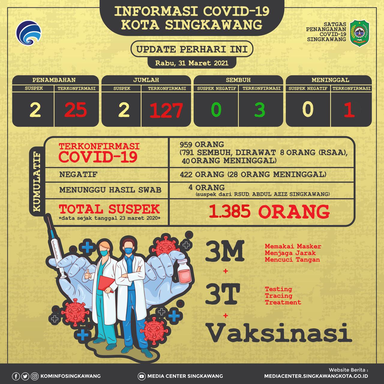 SINGKAWANG KITA- Singkawang mengalami pertambahan angka kasus Covid-19 yang cukup tinggi, tercatat hingga update terakhir Rabu 31/3/2021, sebanyak 127 kasus terkonfirmasi aktif yang di unggah oleh gugus tugas covid-19 Singkawang melalui akun Instagram Dinas Kominfo Singkawang.