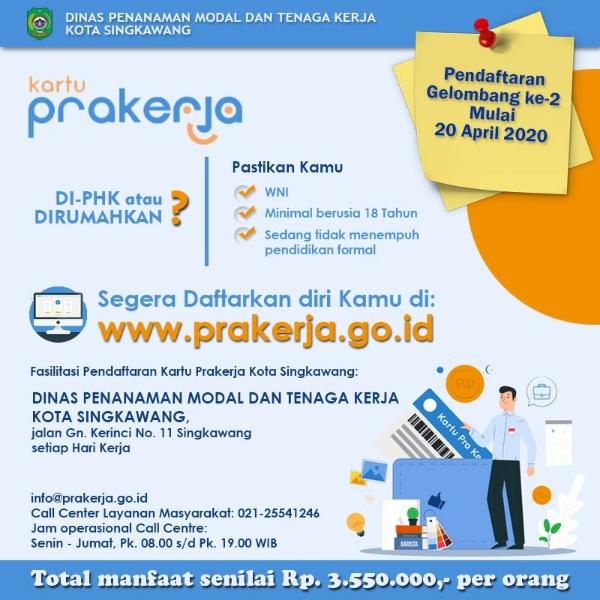 Untuk informasi terkait kartu prakerja dapat diperoleh di info@prakerja.go.id dan Call Center layanan masyarakat di nomor 021-25541246. Jam operasional Call Center setiap Senin-Jumat mulai pukul 08.00-19.00 Wib.