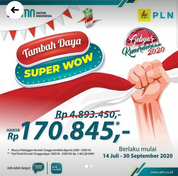 SINGKAWANG, KITA- UP3 PLN Singkawang akan mengadakan promo Gebyar Kemerdekaan RI tahun 2020 berupa tambah daya “Super Wow” dari tanggal 14 Juli sampai dengan 30 September 2020 khusus pelanggan rumah tangga dari 2.200-5.500 VA dengan tarif biaya pemasangan (promo) sebesar Rp170.845.
