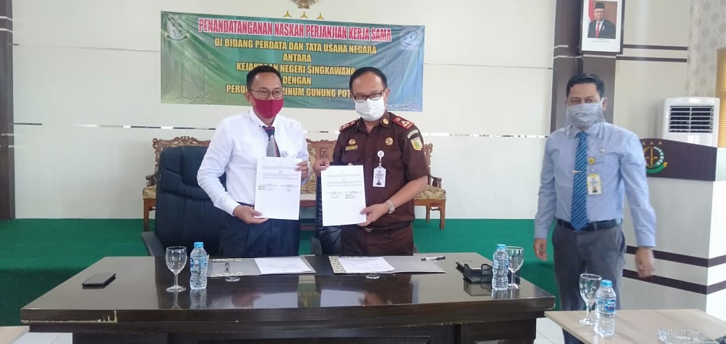 SINGKAWANG, KITA- Perusahaan Umum Daerah (Perumda) Air Minum Gunung Poteng Singkawang bersama Kejaksaan Negeri Singkawang melakukan penandatanganan naskah perjanjian kerjasama dibidang Perdata dan Tata Usaha Negara, di Aula Kantor Kejaksaan, Rabu (3/6).
