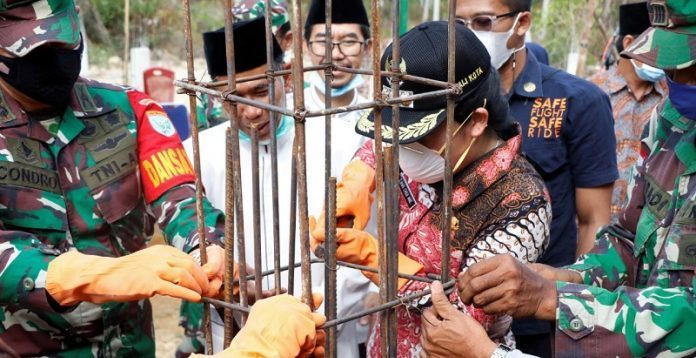SINGKAWANG KITA – Wali Kota Singkawang, Tjhai Chui Mie melakukan pemancangan tiang pertama Masjid Andalusia Madrasah Tsanawiyah Negeri (MTsN) Singkawang di jalan Ratu Sepudak, Jumat (9/4/2021).